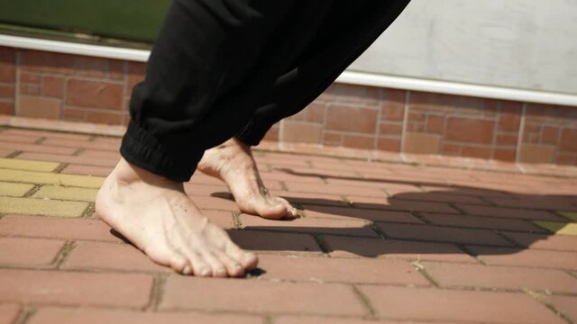close-up of bare legs on the street on a sunny day. feet trample on the tile, rise on toes.