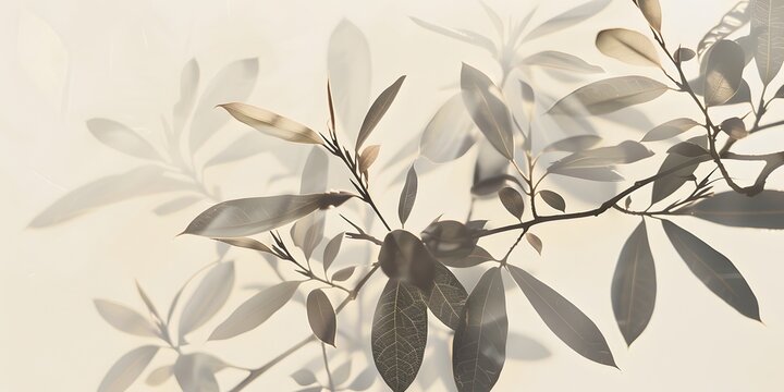 Serene Branch: Abstract botanical artwork featuring a delicate branch adorned with muted grey and beige leaves, creating a tranquil and ethereal ambiance.