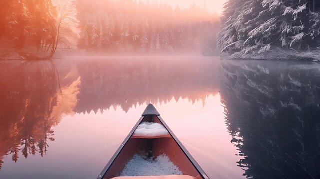 A tranquil winter scene featuring a canoe on a calm lake surrounded by dense forest. The canoe is filled with snow, and the water reflects the surrounding trees and the misty atmosphere.