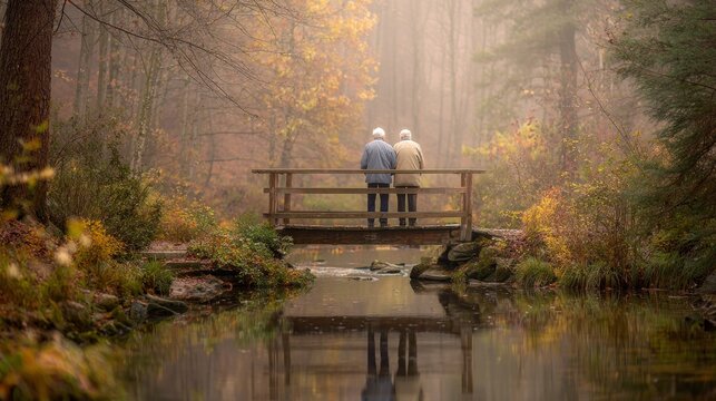 nature retreats, a peaceful wooden bridge over a bubbling stream, enveloped by golden autumn leaves and serene forest sounds, offering effortless balance at a forest therapy retreat