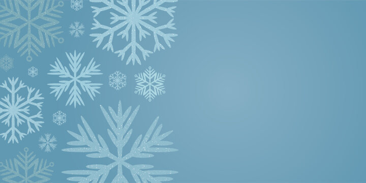 Blue snowflake patterns on a blue background with space for text. Winter decorative element for Christmas. Abstract winter holiday background.