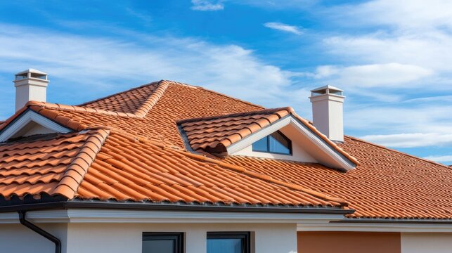 A sleek white house roof features neatly placed chimneys against a vibrant blue sky, exemplifying modern architecture and construction technique in a tranquil setting