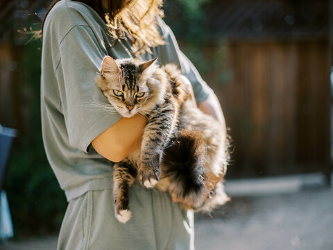 woman hand pet beautiful fluffy red Siberian cat walking outdoors in autumn countryside yard, pet under tree among fallen leaves in sunlight on nature
