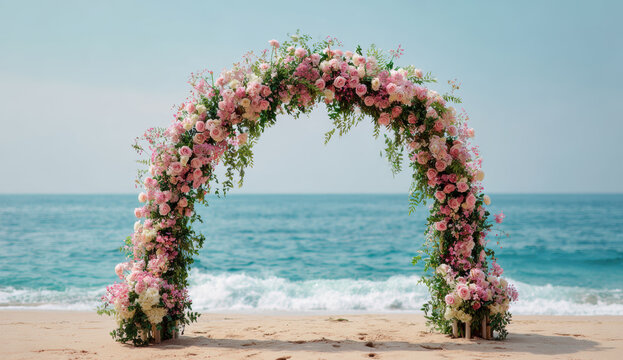 Floral wedding arch creating a romantic ceremony setting on a tropical sandy beach with ocean waves