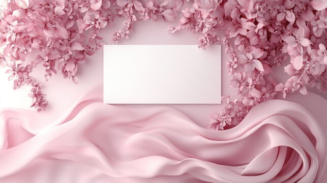A soft pink background adorned with flowers and draped fabric, perfect for invitations or announcements.