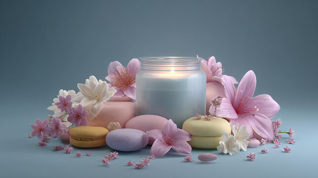 A still life of a candle with flowers and sweets arranged around it, creating a tranquil atmosphere.