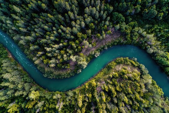 A beautiful winding river carves its path through a dense, lush green forest, captured from an elevated drone perspective.