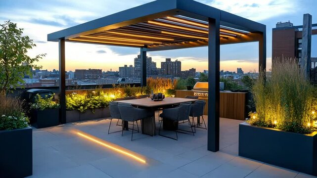 Rooftop terrace with dining pergola, clean flooring, surrounding rail lights and modern planter layout