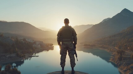 isolated man sitting at camping chair at mountain top with lake view at morning