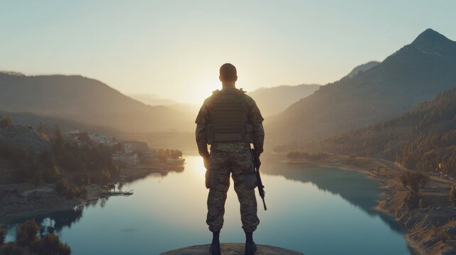 Serenely situated beside a calm lake, a worn pair of hiking boots and a sturdy backpack rest, surrounded by lush greenery and majestic mountains.