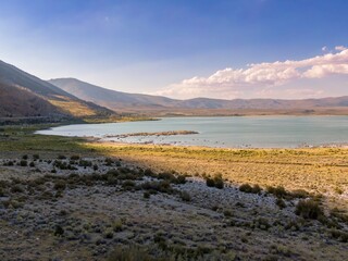 Scenic view of Mono Lake in California, USA, showcasing its unique tufa formations and surrounding mountains under a clear blue sky. The lake's ecosystem supports diverse wildlife.