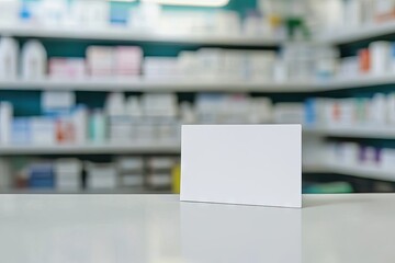 A blank business card placed on a wooden table in a modern retail space. with shelves of assorted cosmetic products and plants in the background. suggesting a serene shopping experience