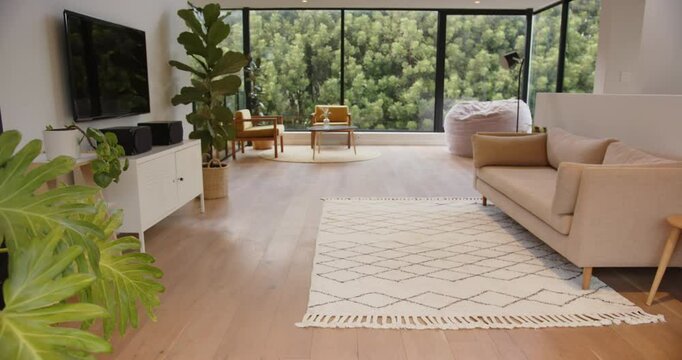 Modern living room with large windows, cozy sofa, and indoor plants, copy space