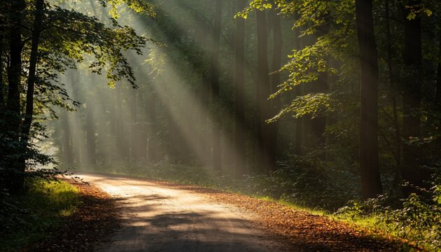 Sunbeams streaming through misty green forest trees, illuminating a tranquil dirt path covered with fallen leaves during a beautiful, peaceful morning sunrise