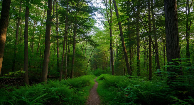 Serene forest landscape with winding dirt path through tall trees and lush green foliage in natural outdoor environment with sunlight filtering through leaves