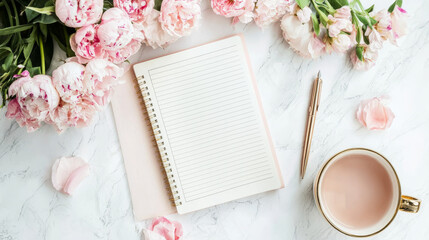 Monday Morning Planning: An open schedule planner, pastel pens, and tea on a light wooden desk, ready for a productive start to the work week with calm organization.