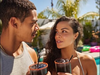 Poolside Serenity: A young couple enjoys each other's company, a refreshing drink in hand, sharing a serene moment of connection by a shimmering pool on a bright, sunlit day.