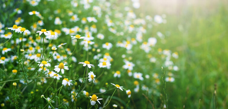 Panoramic idyllic mountain landscape with lush green meadows and wildflowers in bloom
