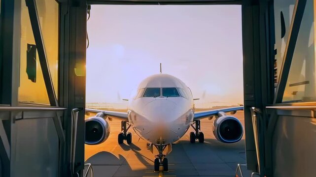 Jet bridge leading plane at sunset, golden light illuminating glass corridor and metal frame, aircraft nose framed in tunnel, calm boarding atmosphere with distant ground vehicles