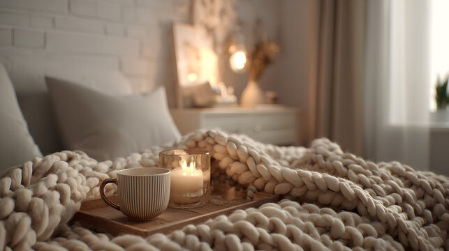 Cozy Hygge Bedroom Warm Knit Blanket, Candlelight, and Tea