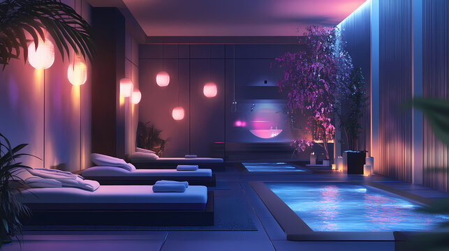 A soothing setup of a spa or wellness center designed for relaxation and sleep therapy with ambient lighting and tranquil decor. Ambient Lighting. Illustration