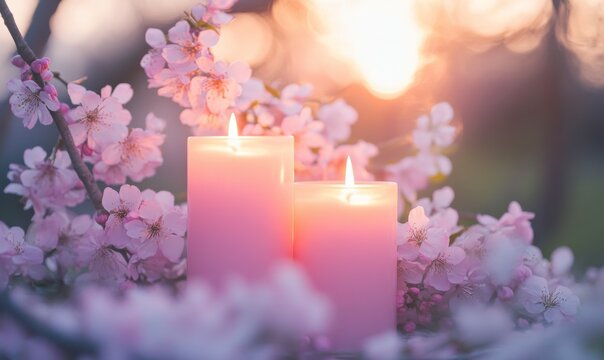 Pink heart candles burning, rose petals, light background; romantic ambiance, ideal for Valentine's Day cards