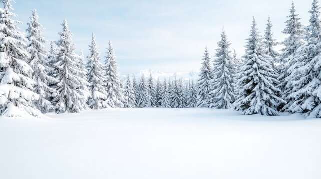 Winter wonderland scene with snowcapped mountains and forest