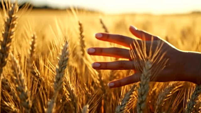 A hand gently touching golden wheat in a sunlit field during harvest season, evoking a sense of tranquility