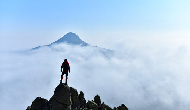 Hiker on Mountain Trail: Panoramic View with Sky Copy Space