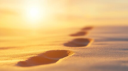 Footprints on sandy beach, golden sunset casting warm glow on serene landscape, perfect for relaxation themes and travel promotions