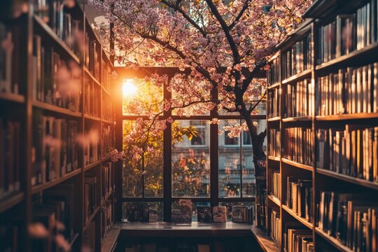 Sun-Drenched Parisian Bookstore with Open Windows and Cherry Blossoms