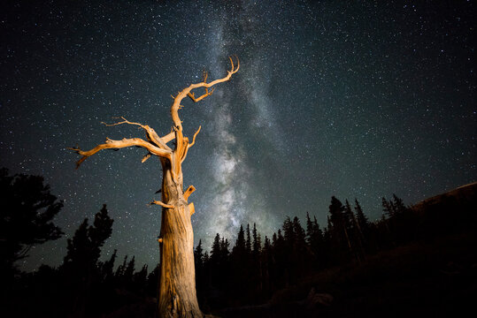 Scenic view of bristlecone pine against milky way in Mount Goliath Natural Area