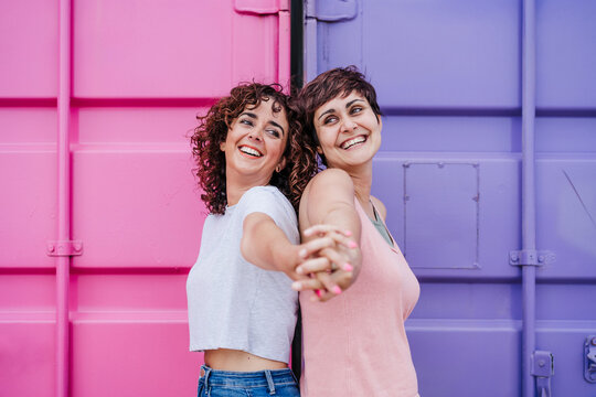 happy lesbian couple holding hands over pink and purple background. Love is love. LGTBI concept