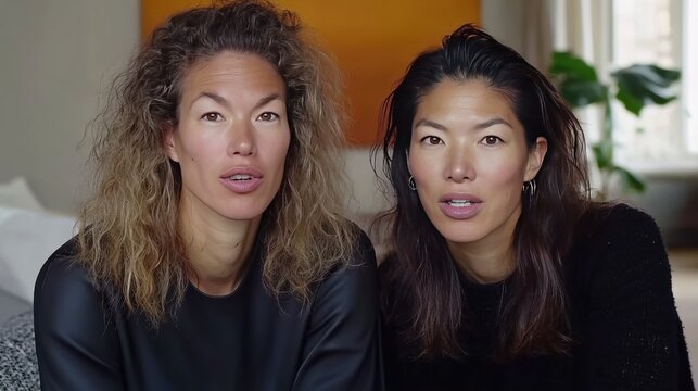 Two asian transgender women with long hair are sitting next to each other. The trans girls are looking into the camera