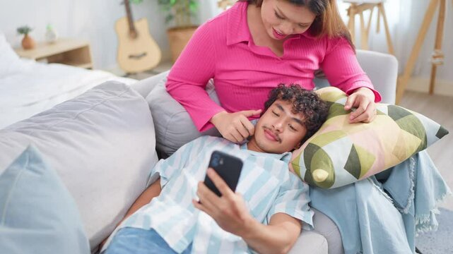 Cinematic shot of carefree happy smiling romantic homosexual male gay and transgender woman couple in love is enjoying time together is hugging and kissing as sign of timeless forever love at home.