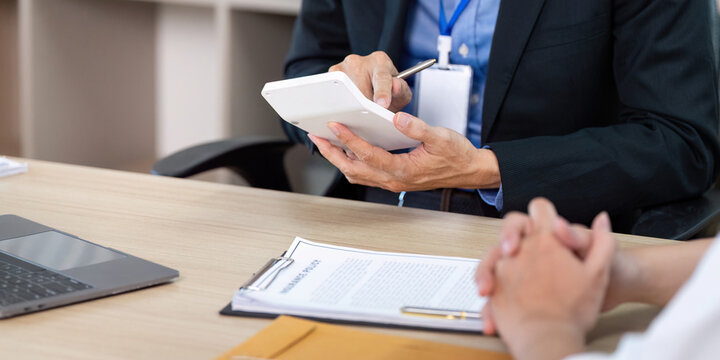 Insurance Agent Using Calculator. Business professional calculating policy costs for a client.