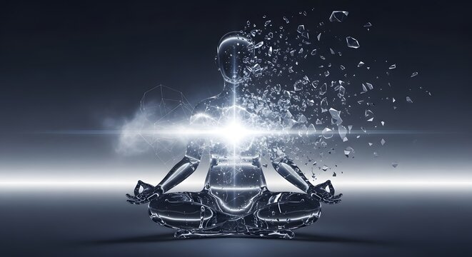 Advaita: a meditating figure in the lotus position, breaking into pieces, symbolizing transcendental states of mind, spirituality and union