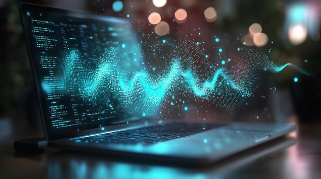 Laptop with audio waveform on screen, representing podcast transcription with text and sound.