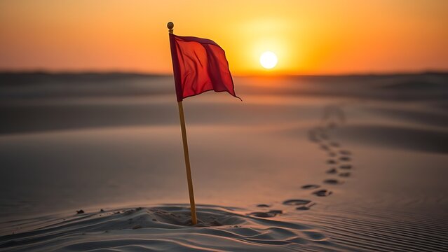sedition. Broken flagpole in sandy ground with retreating footprints, sunset symbolic of surrender. inspiring travel planning.
