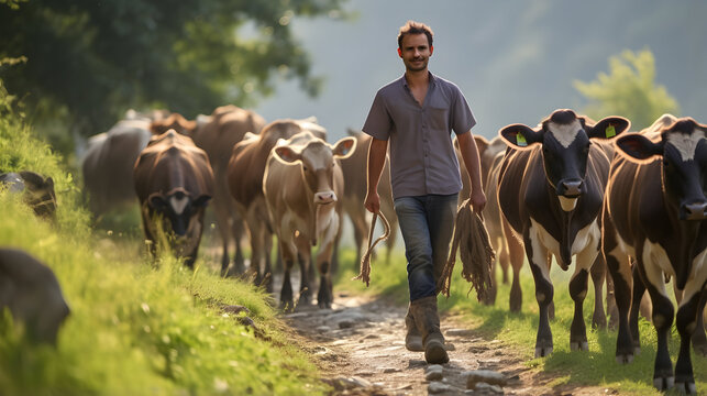 fermier qui marche avec son troupeau de vache pour la transhumance