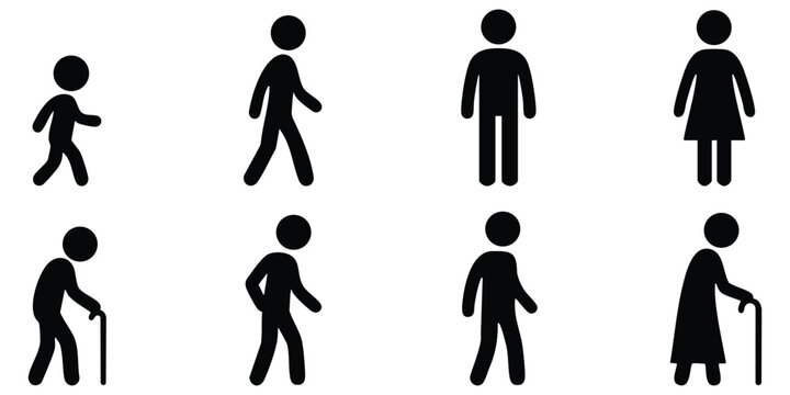 Human life stages, aging process, silhouette evolution, mobility support, generational transition, elderly care, childhood, adulthood, walker, crutches, stroller, posture change, lifespan
