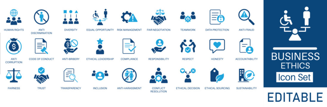 Business ethics icon set. Includes symbols for Compliance, fairness, integrity, equality, code of conduct, honesty, anti corruption, transparency. Solid icons for corporate reports, training, and ESG