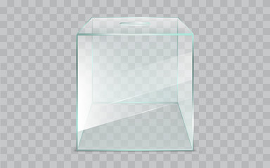 Empty, glass ballot box, square, sealed container with slot 3d realistic vector illustration isolated on transparent background. Democratic elections, fair and clear voting process technology element