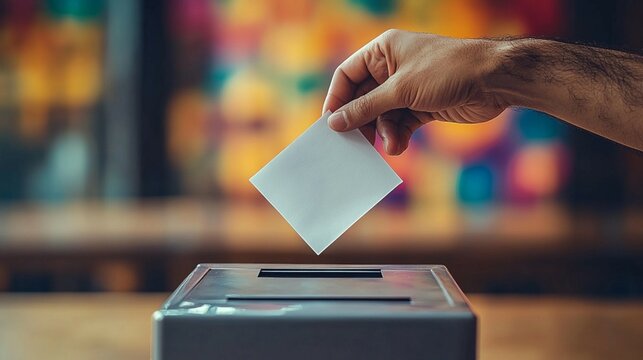A hand placing a ballot into a transparent voting box, illustrating the democratic process and civic engagement.