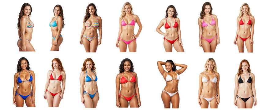 Collection of beautiful women wearing a bikini - set of woman smiling with modern swimwear png - isolated on white or transparent background, diversity, different ethnicities and skin tones, summer hd
