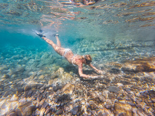 An active woman with a mask and fins explores the beautiful rocky seabed while snorkeling in transparent turquoise water.