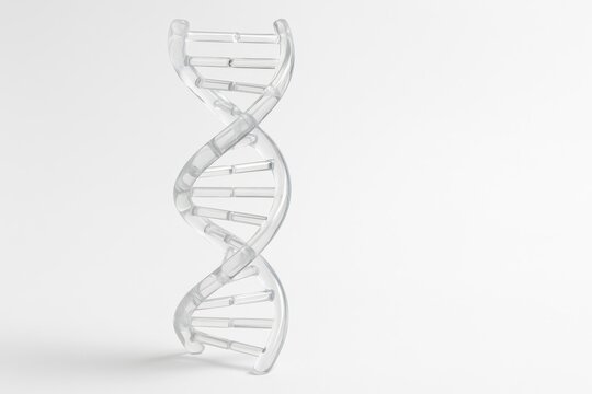 A 3D transparent model of a DNA double helix stands vertically on a white background, symbolizing genetic science, biotechnology, and molecular biology.