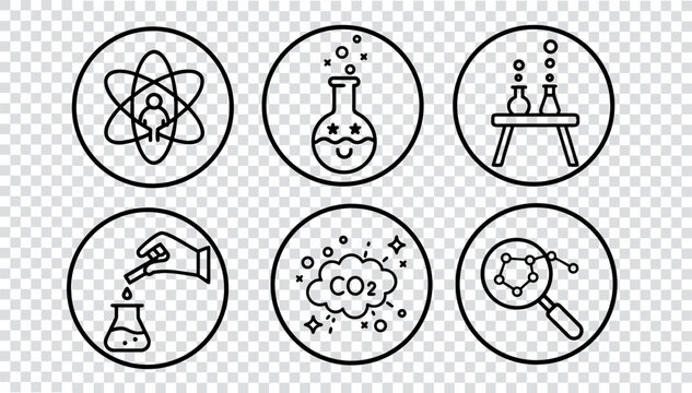 Kids chemistry icon set concept. Science experiments research lab in minimal outline style. Education science learning children book. Simple black line art design on transparent background vector