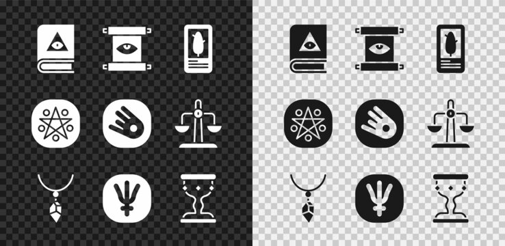 Set Ancient magic book, scroll, Tarot cards, Necklace with crystal, Neptune planet, Medieval goblet, Pentagram in circle and Comet falling down fast icon. Vector