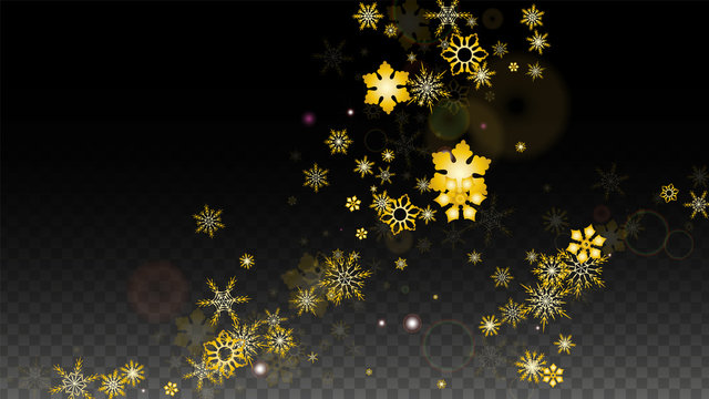 Christmas  Vector Background with Gold Falling Snowflakes Isolated on Transparent Background. Realistic Snow Sparkle Pattern. Snowfall Overlay Print. Winter Sky. Design for Party Invitation.